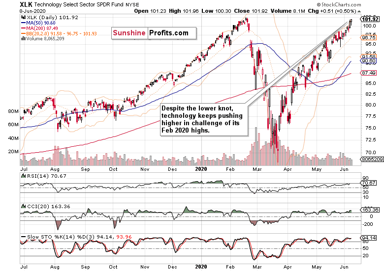 Move on, the uptrend in technology (XLK ETF) is intact whatever intraday selling it meets. With the 2020 highs within spitting distance, the only question is how much of a resistance will they provide – both in time to overcome them, and in depth of price corrections to work out the extended daily indicators' readings before the bulls say enough is enough.