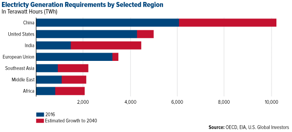 “To meet rising demand, China needs to add the equivalent of today’s United States power system to its electricity infrastructure by 2040,” the IEA writes, “and India needs to add a power system the size of today’s European Union.”
