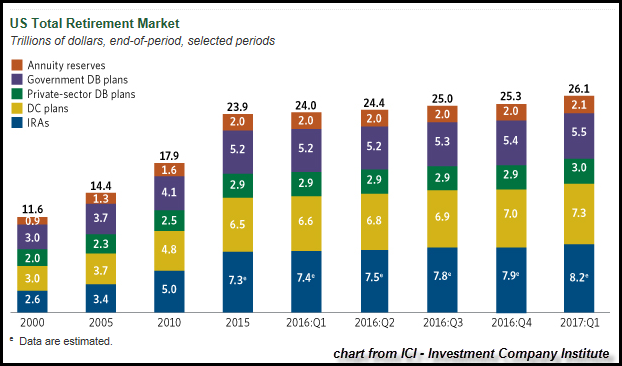According to the ICI – Investment Company Institute, the U.S. Retirement Market hit a new record $26.1 trillion in the first quarter of 2017:
