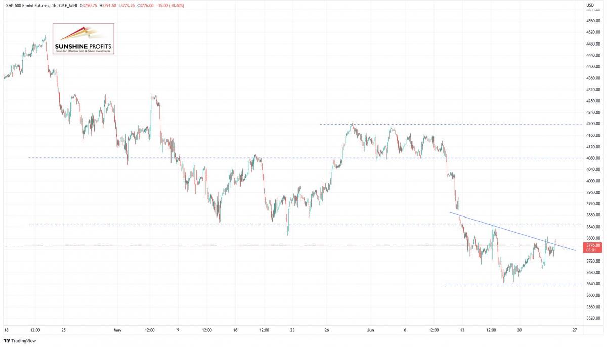 Let’s take a look at the hourly chart of the S&P 500 futures contract. Last week it broke below the previous consolidation. The market reached new medium-term low on Friday, as it tumbled below the 3,700 level. This morning it is fluctuating slightly below the short-term resistance level of 3,800. (chart by courtesy of http://tradingview.com):