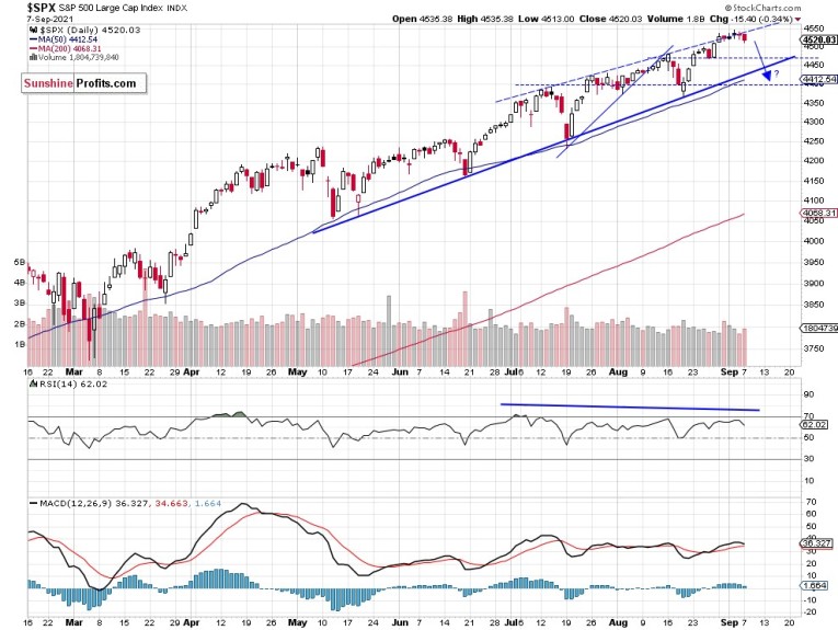 The nearest important support level of the broad stock market index remains at 4,500, and the next support level is at 4,465-4,470, marked by the previous Thursday’s low. On the other hand, the nearest important resistance level is at 4,550. The S&P 500 bounced from its four-month-long upward trend line recently, as we can see on the daily chart (chart by courtesy of http://stockcharts.com):