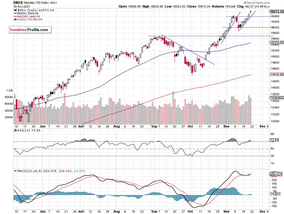 Let’s take a look at the Nasdaq 100 chart. The technology index reached the new record high of 16,625.86 on Friday, led by megacap tech stock rallies. It accelerated above its short-term upward trend line after breaking above the resistance level of 16,400 on Thursday. There have been no confirmed negative signals so far. However, we can see some short-term overbought conditions.