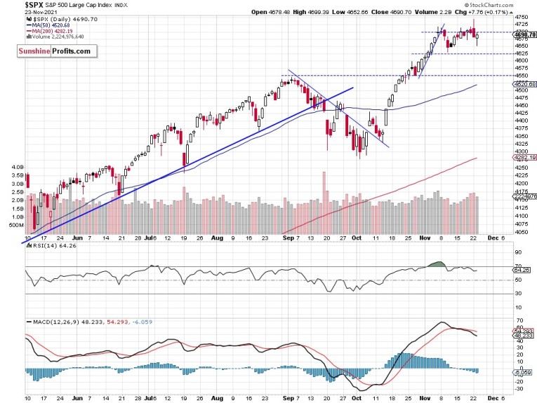 The nearest important support level remains at 4,630-4,650 and the next support level is at 4,600. On the other hand, the resistance level is at 4,700-4,750. The S&P 500 continues to trade along the 4,700 level, as we can see on the daily chart (chart by courtesy of http://stockcharts.com):