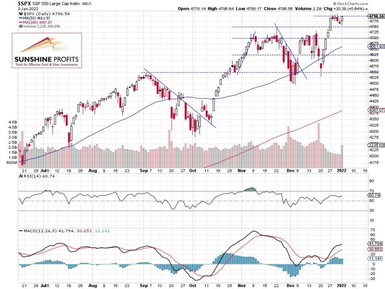 The broad stock market index gained 0.64% on Monday, Jan. 3, as it retraced most of the recent decline from last Thursday’s record high of 4,808.93. Yesterday the index fell to the local low of 4,758.17, before advancing almost 40 points. The S&P 500 index remains way above the local highs from November and December. Stocks broke above the consolidation and we had a quick Santa Claus rally. The broad stock market’s gauge continues to trade within a short-term consolidation. For now, it looks like a relatively flat correction within an uptrend.