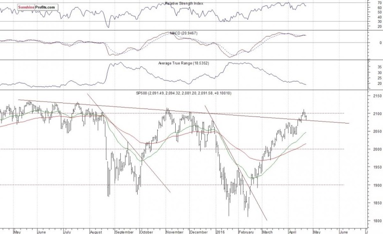 Concluding, the broad stock market continues to fluctuate following its over the two-month long rally. The S&P 500 index remains relatively close to its last year's medium-term local highs. We still can see technical overbought conditions that may lead to uptrend's reversal or downward correction. However, there have been no confirmed short-term negative signals so far. Our speculative short position has been closed at the stop-loss level of 2,100 on Tuesday (S&P 500 index; the S&P 500 futures contract has reached its pre-session high at the level of 2,098 - 10 points above yesterday's daily high). We lost 54.44 index points on that trade, betting against over two-month-long uptrend. It is always important to set some exit price level in case some events cause the price to move in the unlikely direction. Having safety measures in place helps limit potential losses while letting the gains grow. Currently, we prefer to be out of the market, avoiding low risk/reward ratio trades. We will let you know when we think it is safe to get back in the market.