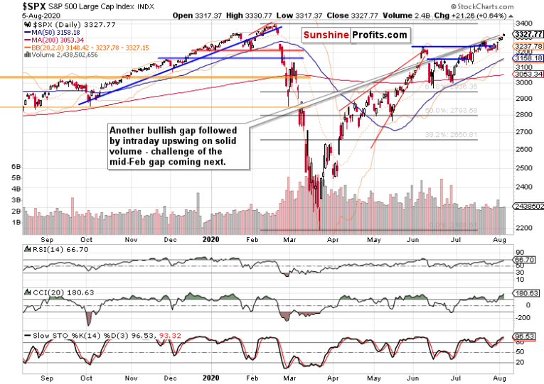 After another bullish gap and more intraday gains, stocks are likely to challenge the mid-Feb gap's upper border at around 3335 shortly. And once they succeed, the Feb all-time highs come next. And frankly, why shouldn't they make it there before the elections uncertainty fully strikes? Protracted stimulus negotiations (let alone a botched deal falling too short of markets' expectations), now that would have some power to rock the bullish boat.