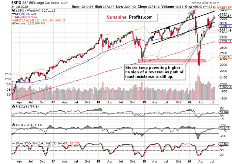Summing up, Friday's S&P 500 reversal is keeping the breakout attempt above the early June highs alive. Credit markets keep acting strong, and the rise in Treasuries just serves to power the TINA (there is no alternative) trade as it pushes investors farther out on the risk curve. Farther than they would be comfortable, but still helping the stock bull at the moment. One of the key watchouts is the daily market breadth, where both the advance-decline line and advance-decline volume remain in the bearish territory. Overall, the balance of risks remains skewed to the upside, though the bulls would benefit from a tight stop-loss locking recent gains.