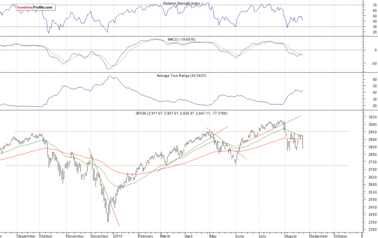 The U.S. stock market indexes lost 2.4-3.0% on Friday, as investors reacted to the negative U.S. – China trade war news. The S&P500 Index retraced almost all of its recent advance and it got back to its short-term local lows. The broad stock market’s gauge is now 6.0% below July the 26th record high of 3,027.98. The Dow Jones Industrial Average lost 2.4% and the Nasdaq Composite lost 3.0% on Friday.