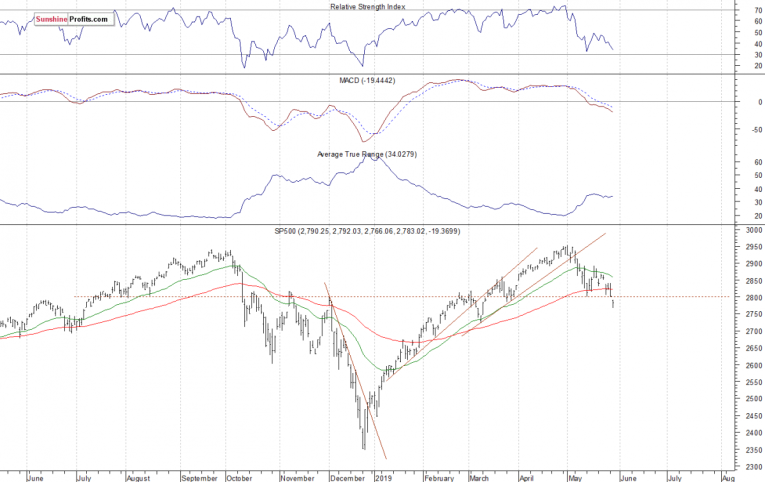 The broad stock market broke above the last year’s high in the early May. But then the index retraced all of the April’s advance. The market also broke below its two-month-long upward trend line. The index fell below the 2,800 mark recently and it extended its month-long decline, as we can see on the daily chart:
