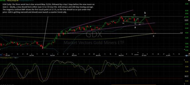 The S&P500 looks as though it wants to top somewhere around May 24th to 25th, while GDX and the gold complex could rise out of a May 25th low into a June 2 top and then rollover hard.