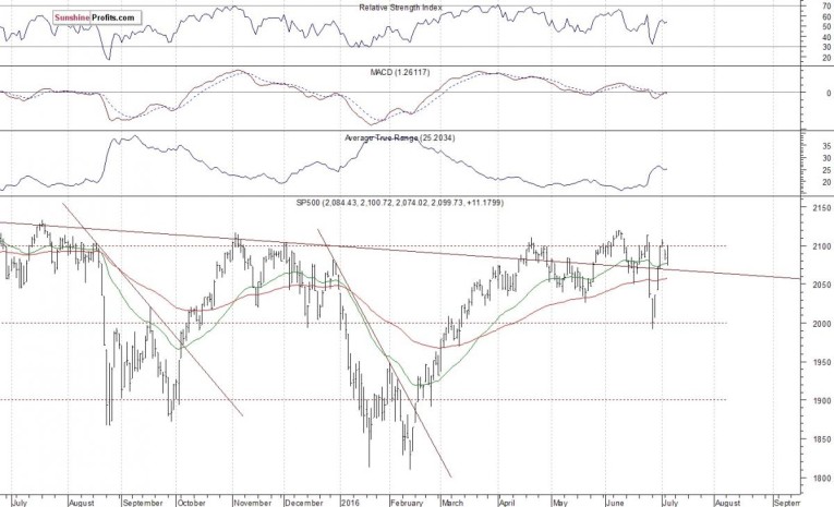 The US stock market indexes gained between 0.4% and 0.8% on Wednesday, extending their short-term fluctuations following late June rally. The S&P 500 index remains close to the level of 2,100. The nearest important level of resistance is at around 2,110-2,120, marked by last month's local highs. The next resistance level is at 2,130-2,135, marked by last year's all-time high. On the other hand, support level is at around 2,080-2,085, marked by previous level of resistance, and the next level of support is at 2,050-2,070. Last year's highs along the level of 2,100 continue to act as medium-term resistance level. Is this some long-term topping pattern or just medium-term consolidation following a rebound off February low?
