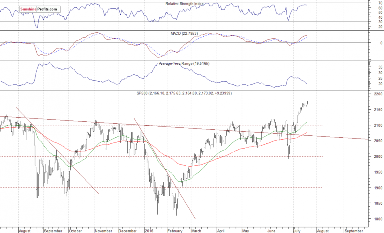 Concluding, the broad stock market extended its short-term uptrend on Wednesday, as investors reacted to quarterly corporate earnings releases. The S&P500 index trades close to its new all-time high. We still can see short-term overbought conditions accompanied by bearish technical divergences. Therefore, we continue to maintain our speculative short position (opened on Monday at around 2,162 - Monday's average opening price of the S&P 500 index). Stop-loss level is at 2,210 and potential profit target is at 2,050 (S&P500 index). You can trade S&P500 index using futures contracts (S&P 500 futures contract - SP, E-mini S&P500 futures contract - ES) or an ETF like the SPDR S&P500 ETF - SPY. It is always important to set some exit price level in case some events cause the price to move in the unlikely direction. Having safety measures in place helps limit potential losses while letting the gains grow.