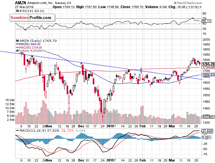 Now let's take a look at the daily chart of Amazon.com, Inc. (AMZN). The price broke above the previous local high early last week and on Thursday it broke above the $1,800 level. However, Friday's trading session was bearish as the stock bounced off the resistance level. The nearest important support level is now at $1,700: