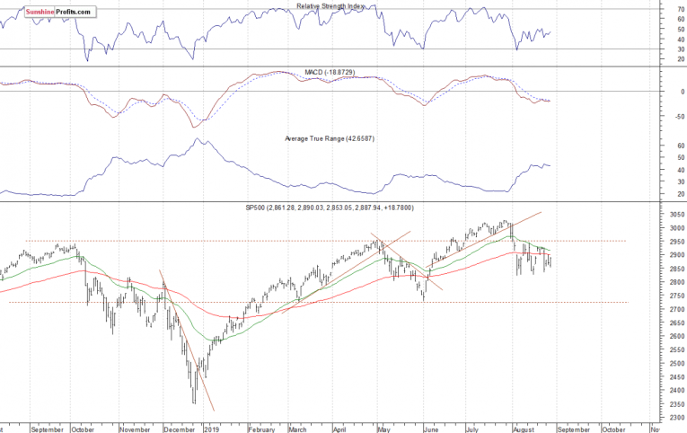 The S&P 500 index broke below the upward trend line in late July, as investors reacted to the Fed’s Rate Decision release, among other factors. We saw technical overbought conditions along with negative technical divergences then. And the market declined following renewed trade war fears. Recently it has been rebounding off a support level of around 2,800-2,820. On Friday it reached that support level again. Today we may see a breakout above the short-term local highs. There will likely be another attempt at breaking above this month’s local highs.