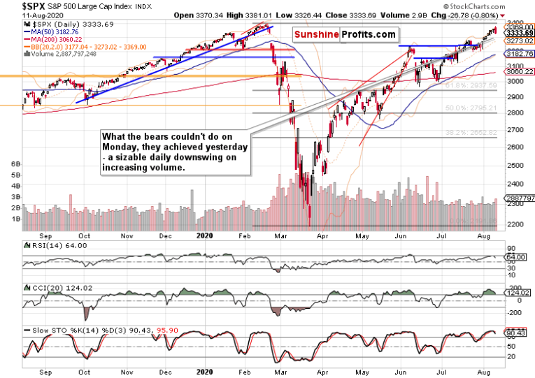 From within spitting distance of the all-time highs, stocks forcefully retreated, validating my call of a bear raid being likely to arrive soon. Just as I wrote, the bulls better tread carefully entering this week's trading – after being soundly defeated on Monday, the bears came back stronger yesterday.