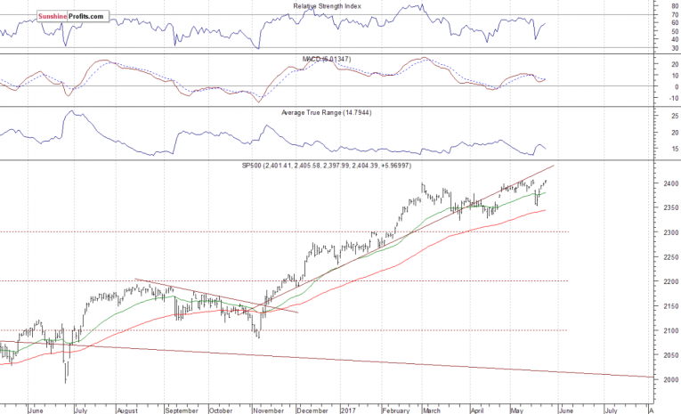 The US stock market indexes gained between 0.3% and 0.5% on Wednesday, extending their recent move up, as investors reacted to economic data announcements, including the FOMC Meeting Minutes release. The S&P 500 index got very close to its May 16 all-time high of 2,405.77. The Dow Jones Industrial Average broke slightly above the level of 21,000 again, and technology Nasdaq Composite got closer to its mid-May all-time high, as it gained 0.4%. The broad stock market has retraced last week's Wednesday's move down, as the S&P 500 index closed slightly above 2,400 mark. Will the uptrend accelerate towards new record highs following an overnight S&P 500 futures contract rally? The nearest important resistance level is at around 2,405. On the other hand, support level is currently at around 2,390-2,395, marked by some short-term local lows. The next level of resistance remains at 2,380-2,385. The support level is also at 2,370, marked by local low. Is this a topping pattern before medium-term downward reversal? The uptrend accelerated on March 1 and it looked like a blow-off top pattern accompanied by some buying frenzy. The S&P 500 index continues to trade below its medium-term upward trend line, as we can see on the daily chart: