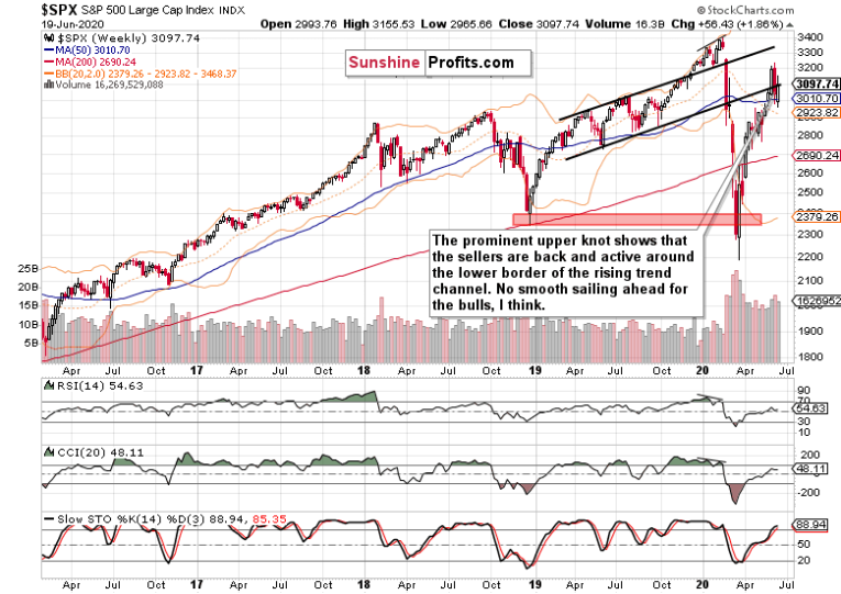 Friday's session added a new wrinkle to the bulls, and especially its close is a fly in the ointment for Thursday's encouraging signs. I anticipated the sideways-to-down period to arrive in July – but aren't we at its doorstep already? The narratives haven't changed one bit – there are the corona second wave fears coupled with the Fed's cautious tone against the data pointing that the recovery is on and new stimulus is underway.