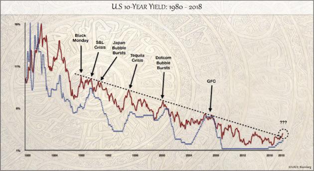First, we have this chart of the 30-year Treasury yield since 2010. Note the very consistent downward trendline. Note also what it did in early 2018.