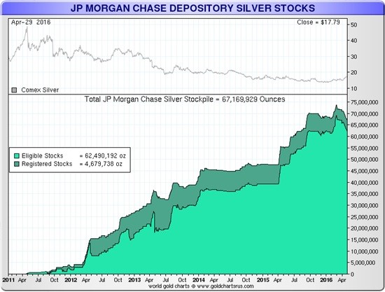 As I mentioned in my previous article, Why Are The Chinese Stockpiling Silver? Big Move Coming?, JP Morgan increased their silver inventories from 4 Moz in April 2011 to 69.4 Moz April 19, 2016.  However, the Shanghai Futures Exchange silver inventories surged from 7.5 Moz in August 2015 to 54.7 Moz on April 19, 2016: