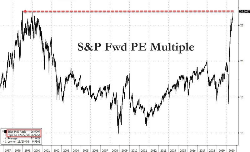 According to Goldman, the S&P’s new highs in February were the first such days in which the VIX closed above 15 since 2015. Six months later, the SPX is back at new all-time highs, and this time the VIX is in the 20’s – the highest VIX level at a new SPX high since Mar-2000. As Goldman’s Rocky Fishman says “this … can reflect growing uneasiness about SPX valuations (in addition to virus-related risk.”