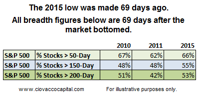- Market breadth as of December 7, 2015 does not look significantly different than similar periods after the S&P 500 bottomed in 2010 and 2011.