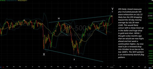 The signs of a stock market top came on July 22 when the SPX made a truncated pseudo 5th wave failure at 2175. There were many astro/cyclical signs pointing to a July 19/20th top. My thinking regarding a continuation higher for the stock market is now not warranted.