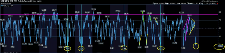 My e-wave read is that we just finished wave (x) of an wxy bearish B wave on Friday and (y) is about to rally in abc fashion into the Nov 2 expected top to my expected target of 2840 SPX. The $BPSPX (Bullish Percent) just reached a rare 5.84 low on the daily RSI.  In the past, huge rallies follow: northmantrader.com