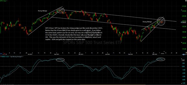 We have now broken down through a rising wedge much like we did back in early November 2015; as well the 4 hour MACD and current action is very similar to that time frame. If we follow the same pattern, we should be down into the low 1700’s SPX minimum by May 2016.