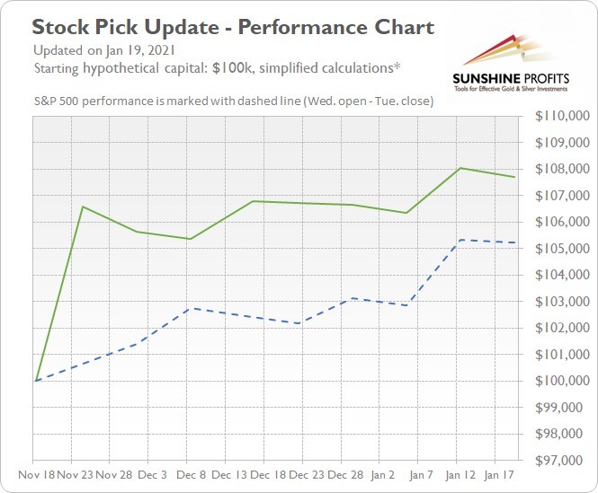 If stocks were in a prolonged downtrend, being able to profit anyway, would be extremely valuable. Of course, it’s not the point of our Stock Pick Updates to forecast where the general stock market is likely to move, but rather to provide you with stocks that are likely to generate profits regardless of what the S&P does.