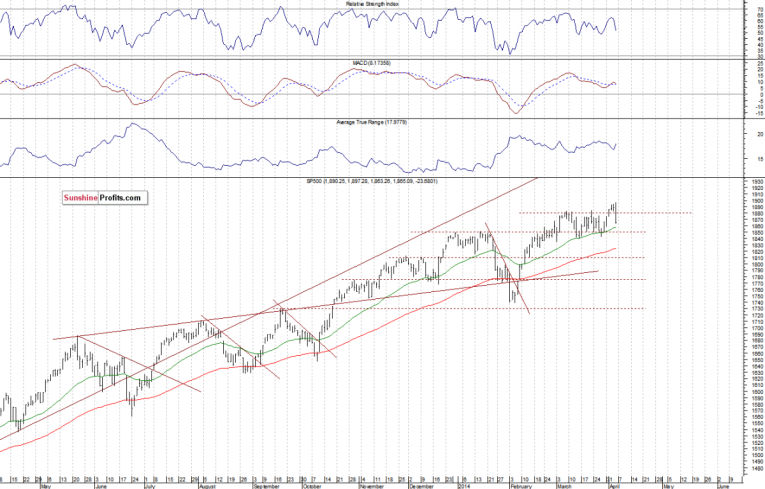The U.S. stock market indexes lost between 1.0% and 2.7% on Friday, as investors reacted negatively to monthly jobs data release. However, the S&P 500 index has managed to reach yet another new intraday all-time high at 1,897.28, before going down to its daily low at 1,863.26. The nearest important resistance remains at 1,880-1,900, and the support is at 1,840-1,850, marked by March local lows, among others. For now, it looks like some sort of a medium-term topping pattern, however, further consolidation along the level of 1,850-1,900 cannot be ruled out: