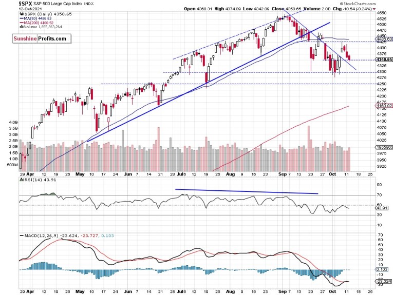 Stocks went slightly lower yesterday, as the S&P 500 index lost 0.24%. The broad stock market index got back to the 4,350 level. Investors were taking short-term profits off the table following last Thursday’s rally. It looks like a downward correction so far, as the index remains above the late Sep. - early Oct. consolidation. This morning the main indices are expected to open between -0.1% and +0.2% vs. their yesterday’s closing prices. So we may see a consolidation along the mentioned support level of 4,350 following today’s mixed Consumer Price Index number release.