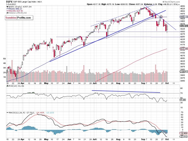 The nearest important support level of the broad stock market index is now at 4,300-4,320, marked by the recent local lows. The next support level is at around 4,250. On the other hand, the resistance level is at 4,380-4,400. The S&P 500 continues to trade below its month-long downward trend line, as we can see on the daily chart (chart by courtesy of http://stockcharts.com):