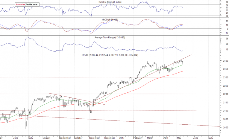 The main U.S. stock market indexes were mixed between -0.2% and +0.2% on Friday, further extending their short-term consolidation, as investors continued to take profits off the table following late April rally. The S&P 500 index remains close to its Tuesday's new all-time high at the level of 2,403.87. The index has broken slightly above the March 1 high last week, before going below the level of 2,400 again. The Dow Jones Industrial Average broke slightly below the level of 20,900 on Friday, and the technology Nasdaq Composite index continued to trade above 6,100 mark. Will the broad stock market index continue its eight-year-long bull market? The nearest important level of support of the S&P 500 index is now at 2,390, marked by short-term local lows. The next support level remains at 2,375-2,380, marked by yesterday's local low and the April 25 daily gap up of 2,376.98-2,381.15. The support level is also at 2,355-2,370, marked by the April 24 daily gap up. On the other hand, the nearest important level of resistance is at 2,400-2.405, marked by new record high, among others. We can see some volatility following six-month-long rally off last year's November low at around 2,100. Is this a topping pattern before medium-term downward reversal? The uptrend accelerated on March 1 and it looked like a blow-off top pattern accompanied by some buying frenzy. The S&P 500 index is currently trading along its medium-term upward trend line, as we can see on the daily chart: