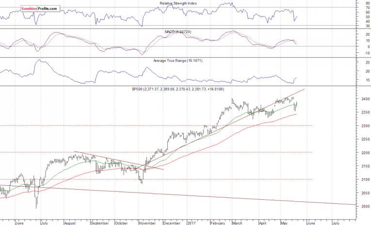 The main U.S. stock market indexes gained between 0.5% and 0.7% on Friday, retracing their Wednesday's move down, as investors' sentiment further improved following economic data releases, among others. The S&P 500 index has reached new record high of 2,405.77 on Tuesday. However, it failed to continue the uptrend and sold off on Wednesday, following a gap down opening of the trading session. Is last week's Thursday-Friday rebound an upward reversal or just correction within a new short-term downtrend? The Dow Jones Industrial Average closed slightly the level of 20,800, and the technology Nasdaq Composite index got closer to the level of 6,100 again. The nearest important level of support of the S&P 500 index is now at 2,370, marked by short-term local low. The next support level is at 2,350-2.355, marked by late April daily gap up, among others. The support level is also at 2,320-2,330, marked by previous local lows. On the other hand, resistance level is now at around 2,385-2,395, marked by Wednesday's daily gap down of 2,384.87-2,396.05. The resistance level is also at 2,400-2,405, marked by the above-mentioned new record high. Is this a topping pattern before medium-term downward reversal? The uptrend accelerated on March 1 and it looked like a blow-off top pattern accompanied by some buying frenzy. The S&P 500 index trades below its medium-term upward trend line, as we can see on the daily chart: