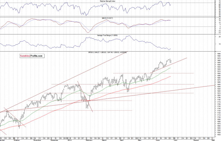 The U.S. stock market indexes gained between 0.3% and 0.7% on Wednesday, retracing Tuesday’s move down, as investors were buying stocks despite worse-than-expected GDP data release. So, our yesterday’s short-term neutral outlook has proved to be quite accurate. The S&P 500 index continues to fluctuate slightly below its recent all-time high of 1,968.17. The resistance level is at 1,960-1,970, and the nearest level of support is at 1,940-1,950. For now, it looks like a flat correction within an uptrend. There have been no confirmed sell signals so far. The market remains above its month-long upward trend line, as we can see on the daily chart: