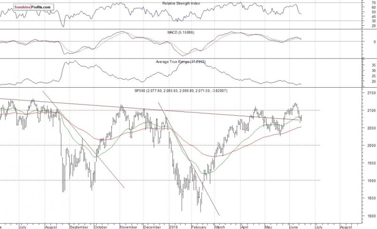 The U.S. stock market indexes lost 0.2-0.4% on Wednesday, extending their short-term consolidation following recent move down, as investors reacted to economic data announcements. The S&P 500 index continues to trade below the level of 2,100. It remains above its May consolidation along the level of 2,050. The nearest important level of support is at around 2,070, and the next support level is at 2,050, marked by some previous local highs. On the other hand, the nearest important level of resistance is at around 2,085, marked by previous support level. The next resistance level remains at 2,100 mark. Last year's highs along the level of 2,100 continue to act as medium-term resistance level. Will the market break above these medium-term highs and continue its seven-year long bull market? Or will it reverse its over three-month long uptrend off medium-term support level at around 1,800?