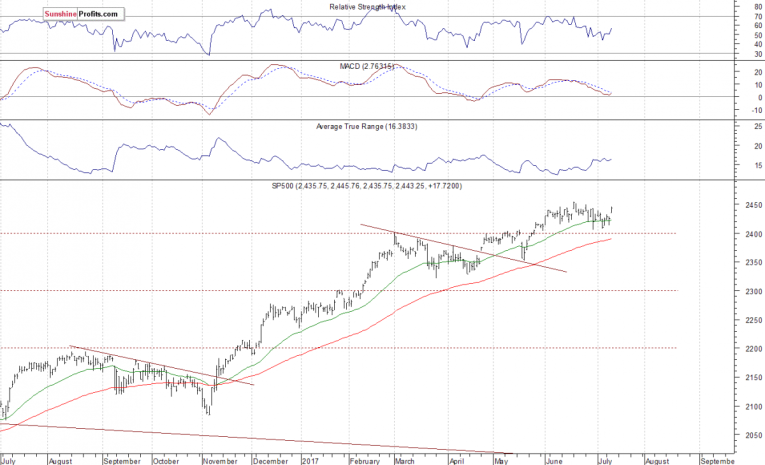 The main U.S. stock market indexes gained between 0.6% and 1.1% on Wednesday, breaking above their recent trading range, as investors' sentiment improved following economic data releases, Fed's Janet Yellen's Congressional Testimony. The S&P 500 index got close to its June 19 all-time high of 2,453.82. It trades just 0.4% below that record high. Stocks have rebounded following their early July move down. The Dow Jones Industrial Average was relatively weaker than the broad stock market yesterday, as it gained 0.6%. However, it reached new record high at the level of 21,580.8. The technology Nasdaq Composite was relatively stronger again, as it gained 1.1%. It has retraced more of its recent move down. The nearest important support level of the S&P 500 index is at around 2,430-2,435, marked by yesterday's daily gap up of 2,429.30-2,435.75. The next support level remains at 2,400-2,410, marked by the May 25 daily gap up of 2,405.58-2,408.01, among others. On the other hand, level of resistance is at 2,450-2,455, marked by all-time high. There have been no confirmed negative signals so far. However, we can see overbought conditions and negative technical divergences. The S&P 500 index is trading within its over month-long consolidation, as we can see on the daily chart: