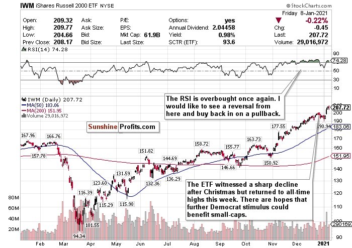I love small-cap stocks in the long-term, especially as the world reopens. A Democrat-dominated Congress could help these stocks too, but in the short-term, the index, by any measurement, has simply overheated. Before January 4th, the RSI for the IWM Russell 2000 ETF was at an astronomical 74.54. I called a pullback happening in the short-term due to this RSI, and it happened. Well now the RSI is back above 74 again, and I believe that a more significant correction in the near-term could be imminent.