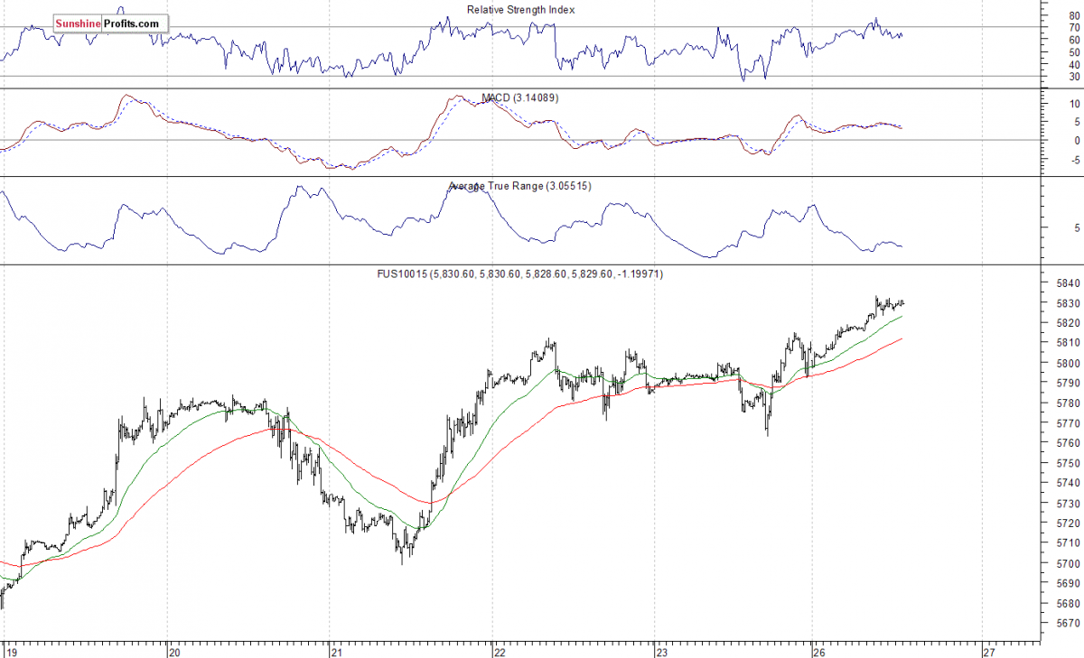 The technology Nasdaq 100 futures contract follows a similar path, as it currently trades within an intraday uptrend. It retraces some more of June 9 sell-off. The nearest important level of resistance is at 5,840-5,850, marked by previous short-term local lows. The next resistance level is at around 5,900, marked by record high. On the other hand, support level is at around 5,800-5,810, marked by previous level of resistance. The next support level is at 5,770, among others, as the 15-minute chart shows: