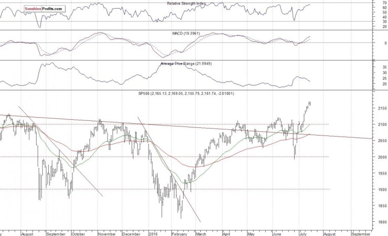 Concluding, the broad stock market remains close to its all-time high, as the S&P 500 index continues to trade above 2,150 mark. We still can see short-term overbought conditions accompanied by bearish technical divergences. Therefore, we decided to open a speculative short position at the opening of today's cash market trading session (S&P500 index). Stop-loss level is at 2,210 and potential profit target is at 2,050 (S&P500 index). You can trade S&P500 index using futures contracts (S&P500 futures contract - SP, E-mini S&P500 futures contract - ES) or an ETF like the SPDR S&P 500 ETF - SPY. It is always important to set some exit price level in case some events cause the price to move in the unlikely direction. Having safety measures in place helps limit potential losses while letting the gains grow.