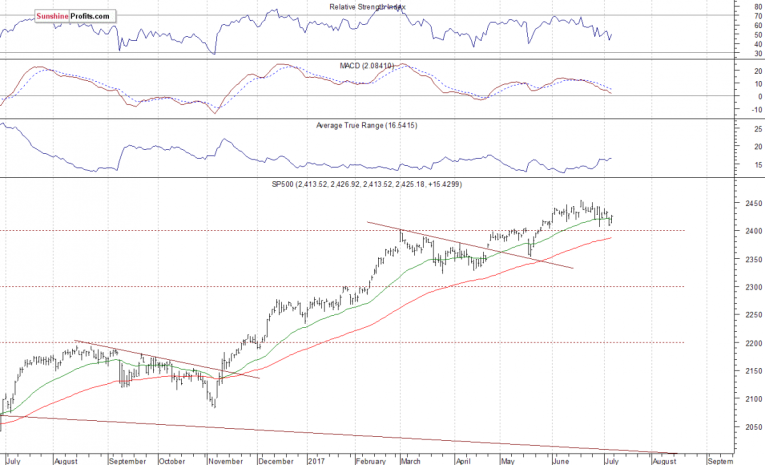 The U.S. stock market indexes gained between 0.4% and 1.0% on Friday, as investors' sentiment improved following better-than-expected monthly jobs data release. The S&P 500 index got close to its late June local low at around 2,405 on Thursday. It has bounced off that support level. The index is now trading just 1.2% below its June 19 all-time high of 2,453.82. It reached new record high after a breakout above short-term consolidation along the level of 2,420-2,440. Stocks have rebounded sharply following their mid-May quick two-session sell-off and continued over eight-year-long bull market off 2009 lows. The Dow Jones Industrial Average gained 0.4% on Friday, as it bounced off support level of 21,300 again. The technology Nasdaq Composite was relatively stronger than the broad stock market, as it gained 1.0%. It has retraced its Thursday's move down. The nearest important support level of the S&P 500 index is at around 2,400-2,410, marked by the May 25 daily gap up of 2,405.58-2,408.01, among others. On the other hand, level of resistance is at 2,425-2,430, marked by recent fluctuations. The next resistance level remains at 2,450-2,455, marked by all-time high. There have been no confirmed negative signals so far. However, we can see overbought conditions and negative technical divergences. The S&P 500 index is trading within its a month-long consolidation, as we can see on the daily chart: