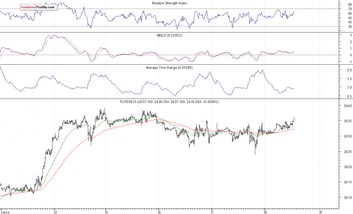 Expectations before the opening of today's trading session are positive, with index futures currently up 0.2% vs. their Friday's closing prices. The European stock market indexes have been mixed so far. Investors will now wait for the Initial Claims number release at 8:30 a.m. The market expects that it was at 240,000 last week. The S&P 500 futures contract trades within an intraday consolidation, following an overnight move up. It continues to trade relatively close to Friday's new record high along the level of 2,440. The nearest important resistance level is at around 2,435-2,440. On the other hand, support level is at 2,425-2,430, marked by recent local lows. The next support level remains at 2,400-2,410. The market trades within a short-term uptrend, as it is above the early March local high. There have been no confirmed negative signals so far. However, we can see some short-term overbought conditions, along with negative technical divergences:
