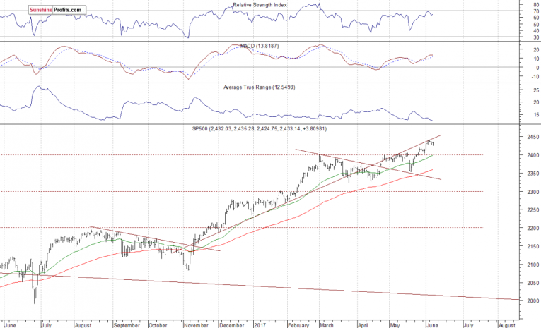 The main U.S. stock market indexes gained 0.2-0.4% on Wednesday, extending their short-term consolidation, as investors continued to hesitate following recent rally. The S&P 500 index trades just 0.3-0.4% below its last Friday's new all-time high of 2,440.23. It has broken above week-long consolidation along 2,400 mark recently. Stocks have rebounded strongly after their mid-May quick two-session sell-off. They continue their over eight-year-long bull market off 2009 lows. The Dow Jones Industrial Average remained below the level of 21,200 on Wednesday, following last Friday's advance to new record high of 21,225.04. The technology Nasdaq Composite remains relatively stronger than the broad stock market, as it continues to trade along the record level of 6,310.6. The nearest important resistance level of the S&P 500 index is at around 2,440-2,450, marked by new record high, among others. On the other hand, support level is currently at around 2,415-2,420, marked by previous resistance level. The next support level is at 2,400-2,410, marked by the May 25 daily gap up of 2,405.58-2,408.01, among others. The support level is also at 2,390-2,395, marked by some short-term local lows. Will the uptrend continue towards 2,500 mark? There have been no confirmed negative signals so far. However, we can see some overbought conditions and negative technical divergences. The S&P 500 index is currently trading close to its November-April upward trend line, as we can see on the daily chart: