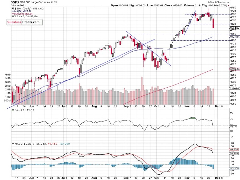 The S&P 500 index lost 2.27% on Friday, Nov. 26, as investors reacted to the news about new Covid variant detected in South Africa. The market broke below its recent local lows and it got away from the 4,700 level. The Friday’s trading action looked like a meaningful downward reversal.