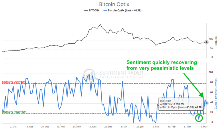 Parallel to the extreme constellation in the CoT-Report the sentiment numbers for Bitcoin reflected an extremely pessimistic mood and panic among Bitcoin traders and investors. Usually, although hard to measure, sentiment numbers are a very good indication and an indispensable tool for contrarians. Of course, in the last couple of days, the promising setup has already changed due to the strong bounce from 7,250 USD up to 9,150 USD. As of now, sentiment has to be classified as more or less neutral.