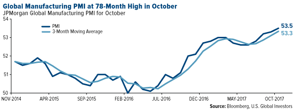 Nearly 10 years after the financial crisis brought the global economy to its knees, conditions have finally improved enough to crystallize my conviction that synchronized global growth is currently underway. Revenue and earnings growth are up year-over-year, not just in the U.S. but worldwide. Despite President Donald Trump threatening to raise tariffs and tear up trade deals, global trade is accelerating. World manufacturing activity expanded to a 78-month high of 53.5 in October, with faster rates recorded in new orders, exports, employment and input prices.