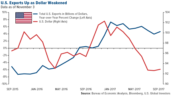 Bolstered by a weaker U.S. dollar, exports by American firms hit a three-year high in August, the Commerce Department reported this month. Exports rose to nearly $200 billion, the highest level since December 2014.