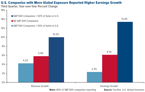 As further proof that the global economy is humming along, S&P 500 Index companies with greater exposure to foreign markets, especially Europe, saw higher revenue and earnings growth in the third quarter than those companies whose business is more focused domestically.