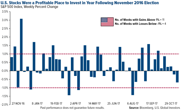 As you’re likely aware, it’s been one year since the U.S. election, and since then the market has surged more than 21 percent on improved global growth, higher corporate earnings and hopes that President Trump’s pro-growth agenda of tax reform and deregulation will improve business conditions in the U.S. In the past 12 months, there have been nearly three times as many weeks posting market gains above 1 percent than those with losses below negative 1 percent. This makes it one of the most profitable markets to have invested in for many years.