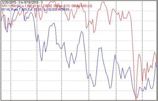 The next chart covers the past 6 months showing the SPX in red and a 10% trend (19 day EMA) of NYSE new highs (NY NH), in green.
